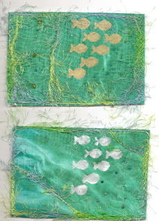 Remember how much fun it used to be waiting to see what the mailman would bring?? Well, I have been receiving the most beautiful postcards from all over the US, Australia, Scotland and Germany. If anyone is thinking about doing an exchange, JUMP IN!! It is great fun and I have been working diligently to get my cards done. Here is a picture of two cards I made last weekend. I actually made ten of these, all a little different. I did some sun printing with cheesecloth last summer and cut it up postcard size. I then used fabric paint and a stamp to put the fish on, then added some beads and stitched eyelash yarn on and around the edge.